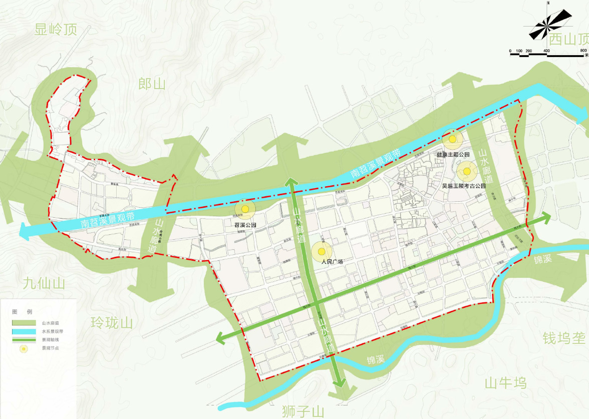 两横:苕溪景观廊道、锦溪景观廊道;