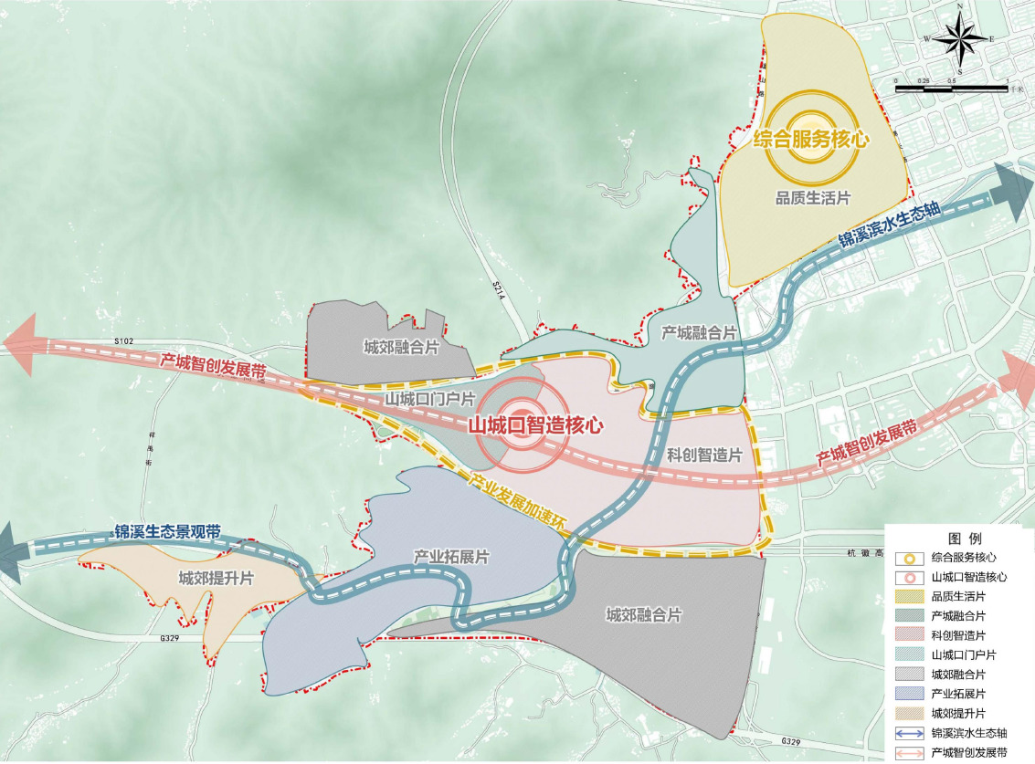 两带:锦溪生态景观带、产城智创发展带;