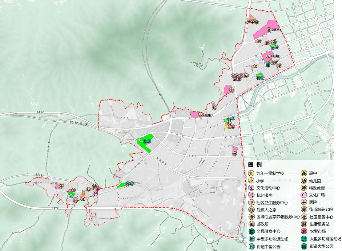 生活圈级公共服务设施:构建10-15分钟社区生活圈以及5分钟社区生活圈。10-15分钟生活圈级公共服务设施主要包括社区卫生服务中心、文化活动中心、杭州书房、全民健身中心、多功能运动场、社区服务中心、街道级养老院、区域性居家养老服务中心、残疾人之家、农贸市场等设施;5分钟生活圈级公共服务设施主要包括社区卫生站、文化活动室、体育活动室、居家养老服务照料中心等设施。