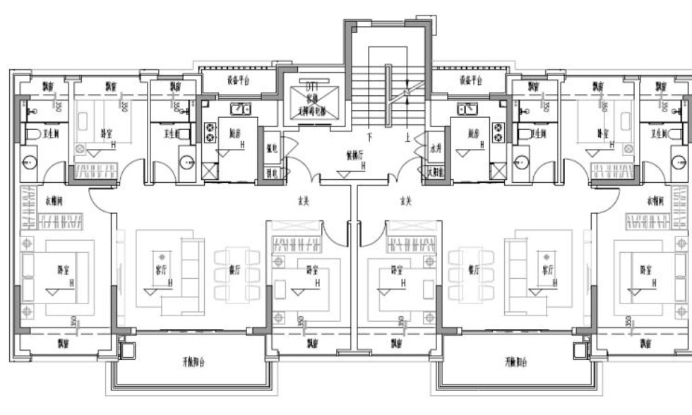 1、2、5、10、19、20、21、22、23#为两梯四户,户型三室两厅两卫,三开间朝南,全屋5飘窗,主卧套房设计,带独立衣帽间和卫生间。
