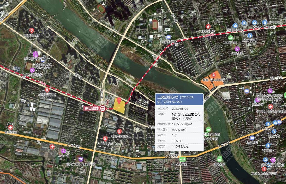地块东侧约1.5公里处,去年6月2日,杭州浙丹企业管理有限公司(绿城)以总价146032万元竞得上虞区城北6号(ZX16-03-01、ZX16-03-02),楼面价14759元/㎡,溢价率13.53%。