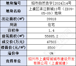 仅1轮报价,绍兴市上虞舜城城市建设开发有限公司(上虞城建)以底价47503万元竞得上虞区滨江新城13号(ZX09-05-09)地块,楼面价8500元/㎡。