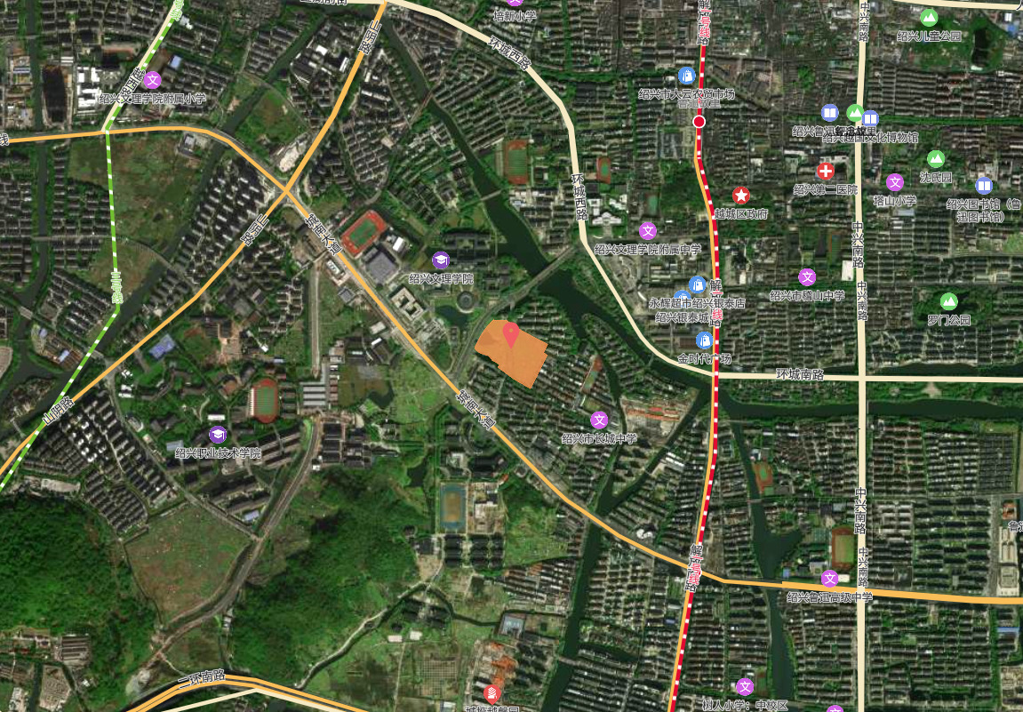 地块位于城南街道,北邻绍兴护城河景观带,直线距绍兴银泰城600米,距地铁1号线城市大道站不到1公里。周边有鲁迅小学(凤鸣校区)、建功中学、鲁迅高级中学等优质教育资源,另有区体育中心、青少年活动中心、罗门公园等休闲配套。