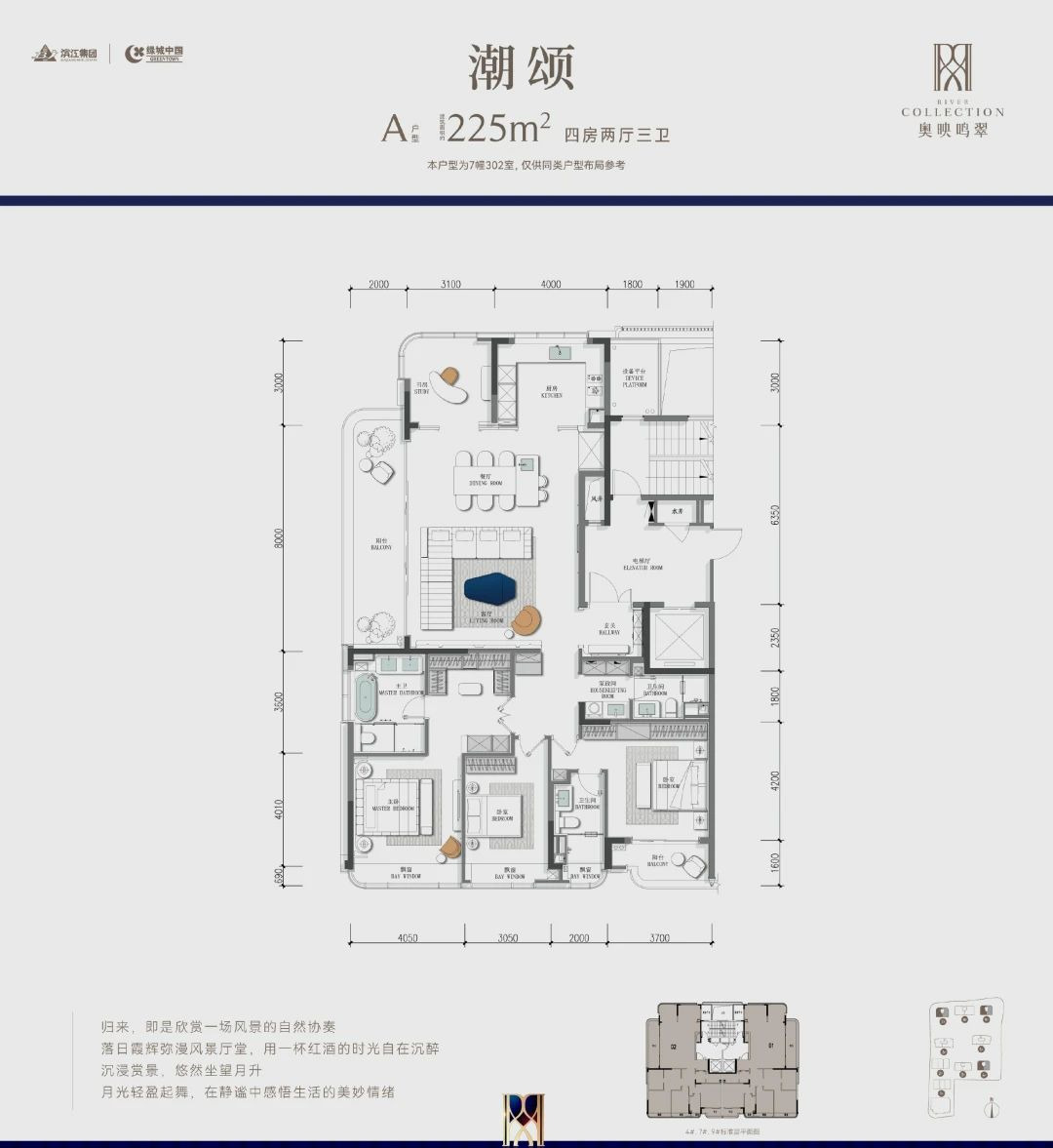 奥映鸣翠府,奥体首个不限价住宅,位于杭州奥体博览中心板块核心区位,项目涵盖18-22F精装高层及6F叠墅两大产品线,其中高层主力户型建面约223-350㎡江境大宅,叠墅产品建面约310-350㎡。
