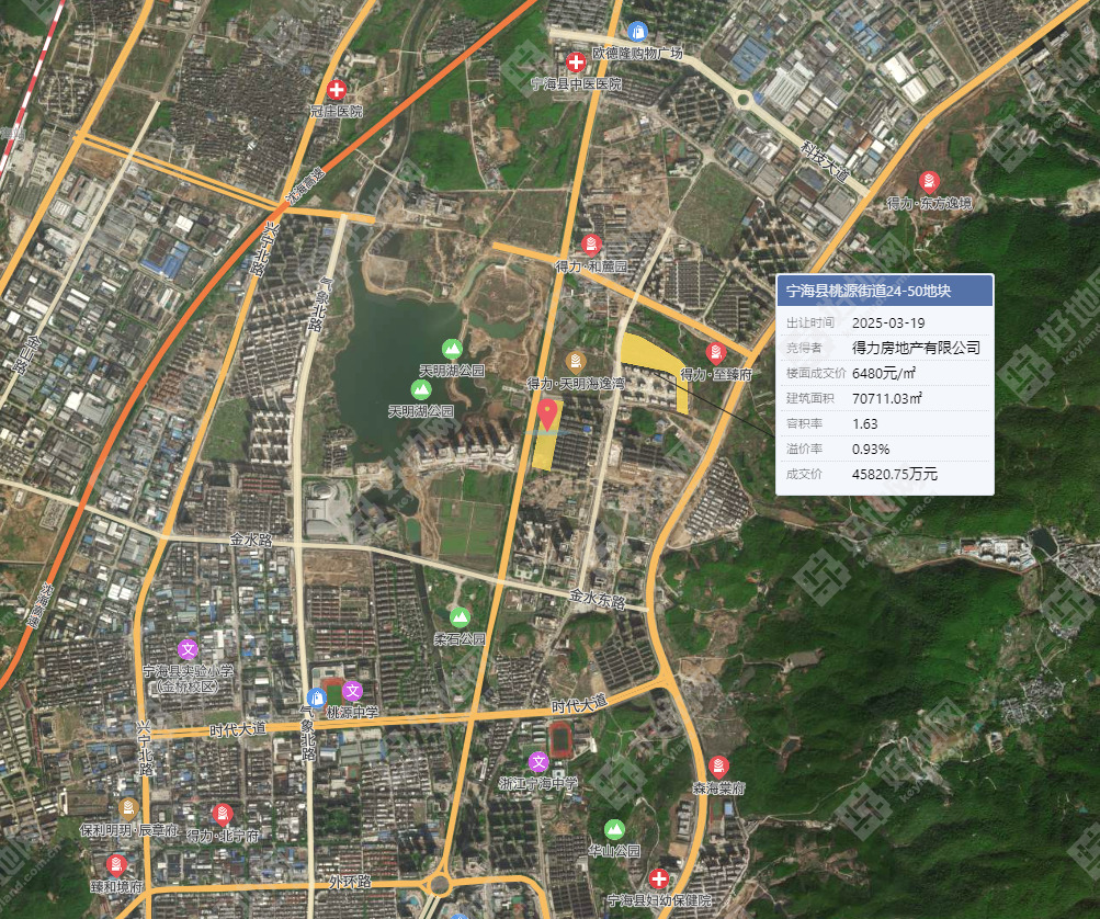 地块东北方向500米处,今年3月19日,得力房地产有限公司以总价45820.75万元竞得宁海县桃源街道24-50地块,楼面价6480元/㎡,溢价0.93%。