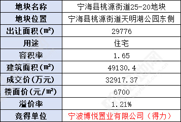 溢价1.21%,宁波博悦置业有限公司(得力)以总价32917.37万元竞得宁海县桃源街道25-20地块,楼面价6700元/㎡。