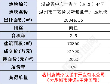 温州鹿城泽泓城市开发有限公司(大承城市建设&中建国际)以低价21700万元竞得温州市丰双片区鞋都单元F-28地块,楼面价3062元/㎡。