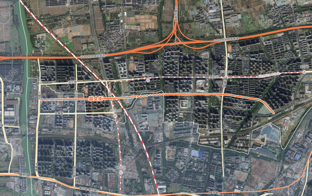 崇文街为城市次干道,规划双向4车道,承担着崇贤新城板块东西向重要的交通组织。目前该道路东西两端临平区内部分已建成,中间段(九曲港-石前港)约400米属于拱墅区范围未建设。