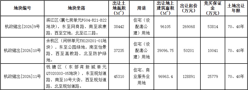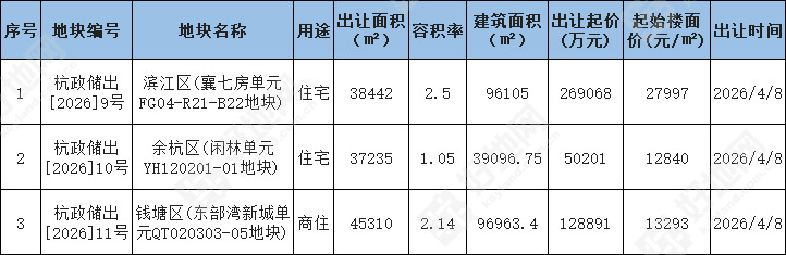 地块分别位于滨江区襄七房单元、余杭区闲林单元和钱塘区东部湾新城单元,总出让面积181.5亩,总建筑面积23.2万方,总起价44.8亿元。其中: