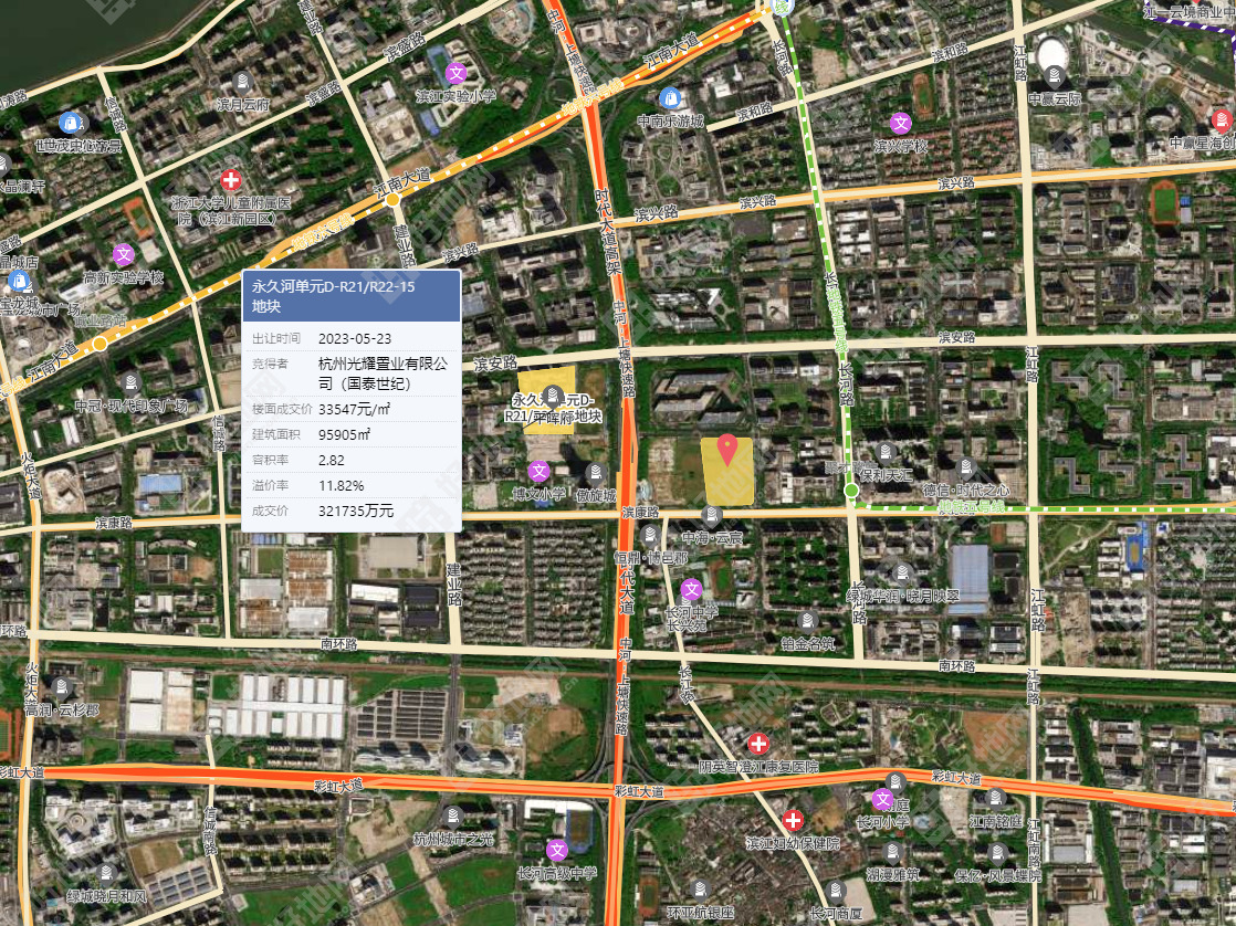 襄七房宅地位于滨江区地理中心,距离5号线聚才路站不到400米,周边网易、阿里巴巴、华为等头部企业集聚。地块容积率2.5,建筑面积9.6万方,起始楼面价27997元/㎡。