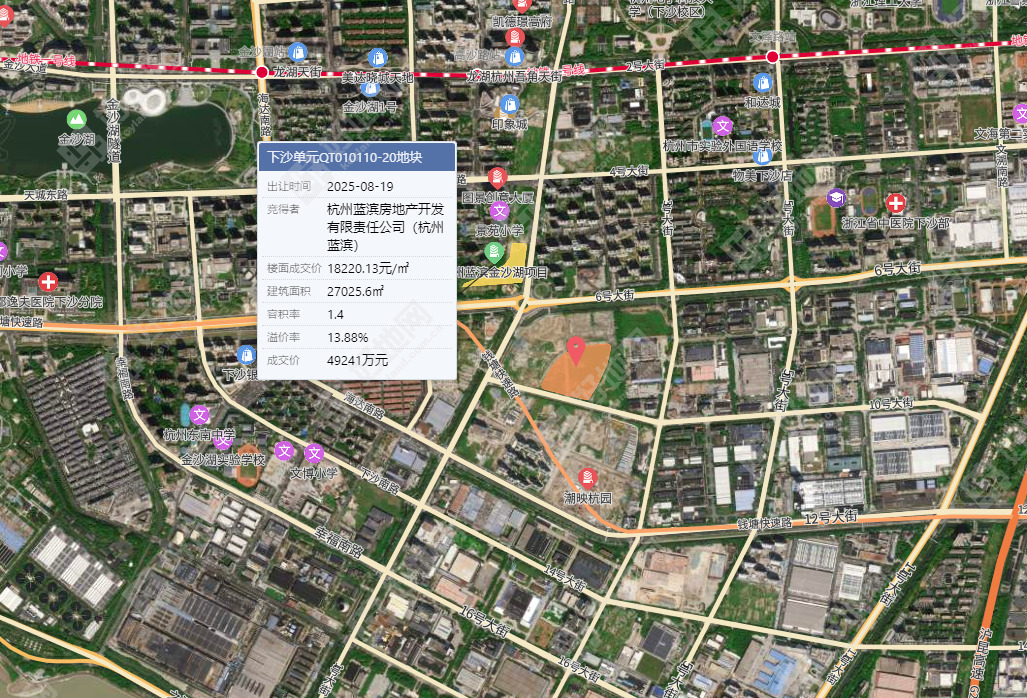 地块北侧距离地铁1号线高沙路站约1.1公里,一站可达金沙湖公园,同时与市中心、钱江新城、萧山机场接驳。配套方面,地块西侧紧邻杭政储出【2025】122号地块(由银泰集团+钱塘产业集团联手打造的银泰综合体项目),也享受金沙湖区块优质配套,步行范围内可达金沙天街、吾角天街、金沙印象城等大型综合体,周边有北景苑小学、景苑中学等教育资源,邵逸夫医院、浙江省中医院提供医疗保障。